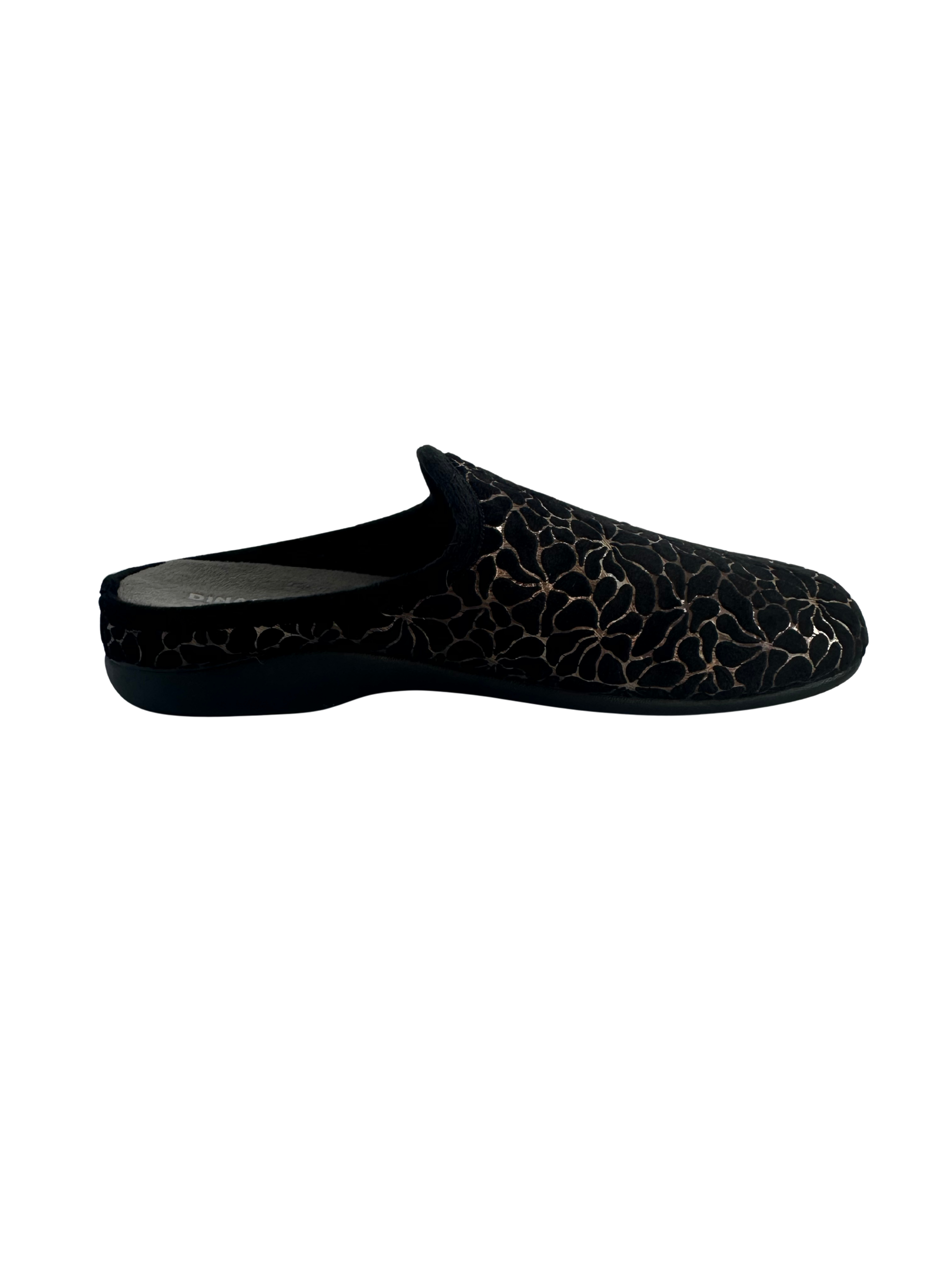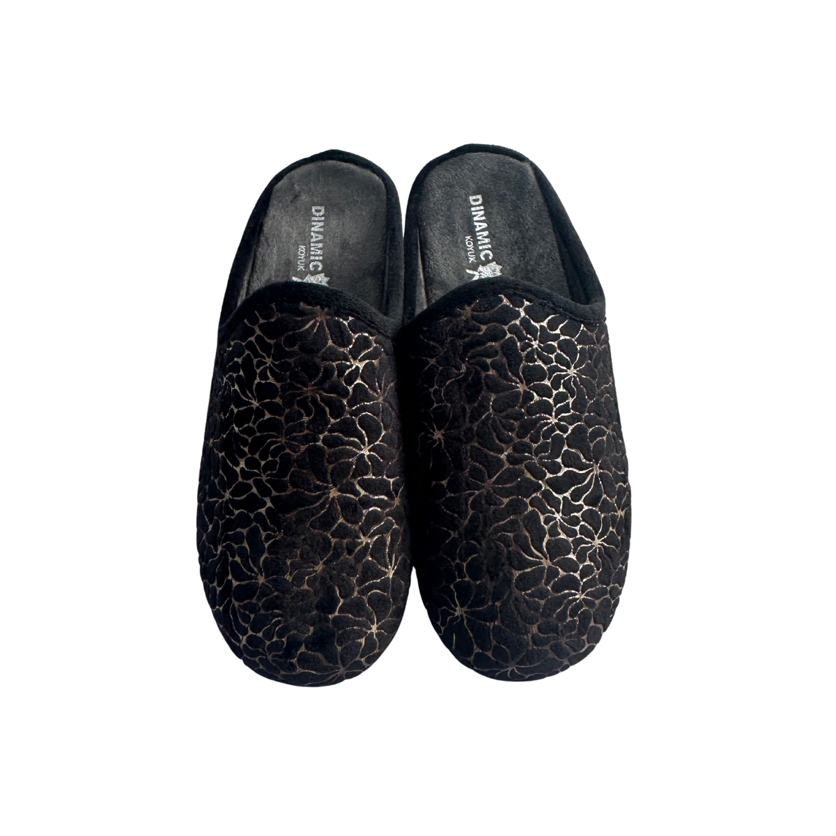 Elegantiškos Dinamic moteriškos šlepetės juodos spalvos su dekoratyviniu raštu. Pagamintos Ispanijoje iš aukštos kokybės medžiagų, suteikiančių komfortą ir stilių kasdieniam avėjimui.
