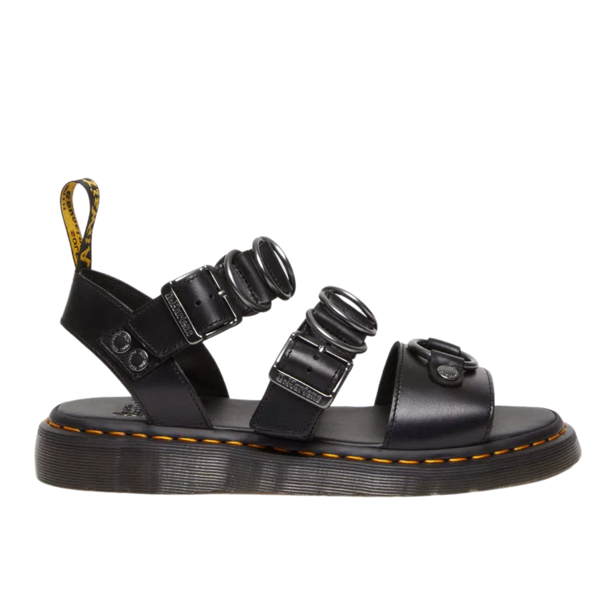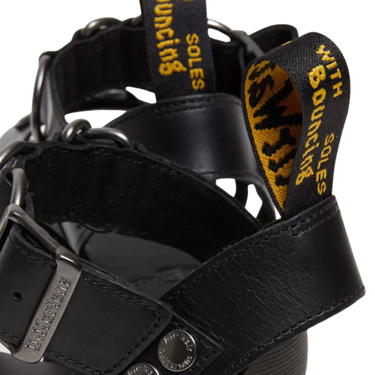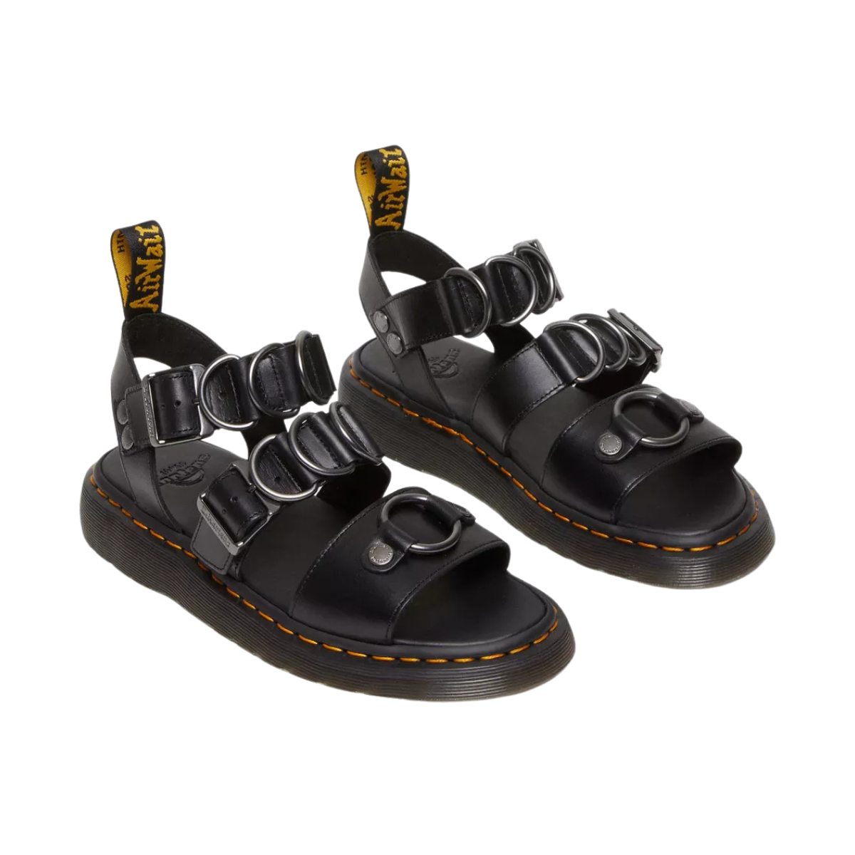Dr. Martens Gryphon Alt – tai masyvesnio „gladiatorių“ stiliaus sandalai su charakteriu. Pagaminti iš aukštos kokybės juodos Brando (vaškuotos, pilno grūdo) odos, kuri gražiai sendama įgauna vintaginį „worn-in“ efektą. Reguliuojami dirželiai su gunmetal spalvos sagtimis ir ryškia metaline furnitūra tvirtai prilaiko pėdą, o patvari Shore platforma su geltona siūle suteikia stabilumo ir ikoninio DM look’o. Puikus pasirinkimas vasarai, kai norisi patogumo ir išskirtinio stiliaus.
