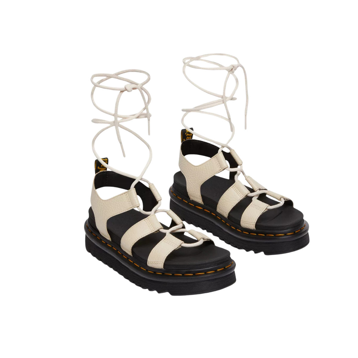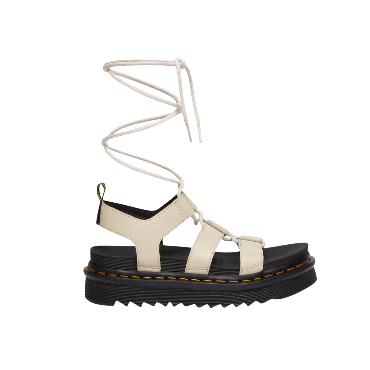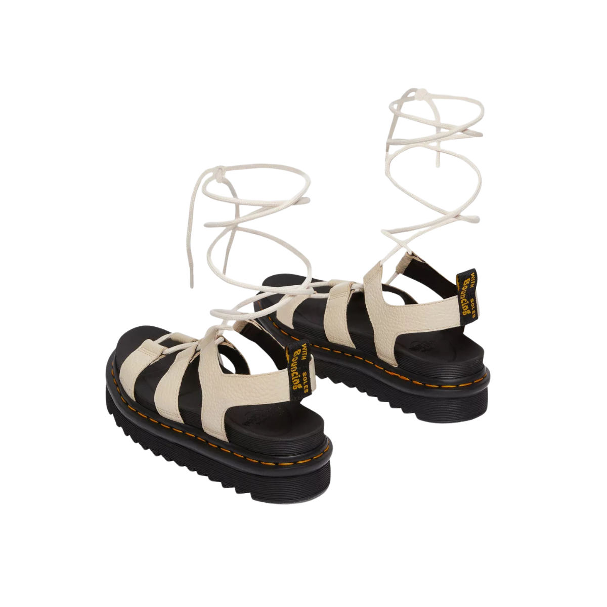 Stilingos, žemo profilio „gladiatorių“ tipo basutės su ilgais raišteliais, kurios leidžia patogiai prisitaikyti prie pėdos ir susikurti išskirtinį vasaros įvaizdį. Pagamintos iš minkštos, grūdėtos tekstūros Milled Nappa natūralios odos, todėl malonios avėti nuo pat pirmo karto. Lengva platforma su rippled Zebrilus EVA padu suteikia amortizaciją ir stabilumą, o SoftWair atminties putų vidpadis užtikrina komfortą visą dieną. Dr. Martens charakterį pabrėžia geltonos siūlės ir firminė kulno kilpelė.