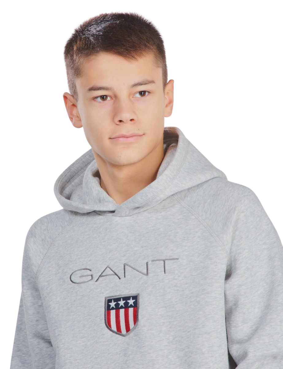 Klasikinis „GANT“ džemperis su gobtuvu – tai patogumo ir stiliaus derinys kasdienai. Pilkos spalvos modelis dekoruotas subtiliu „GANT“ logotipu bei išsiuvinėtu skydu su trimis žvaigždėmis ir raudonomis juostomis, kuris suteikia sportišką, tačiau elegantišką akcentą. Pagamintas iš minkšto medvilnės mišinio, šis džemperis yra itin patogus ir lengvai derinamas prie džinsų ar sportinių kelnių.