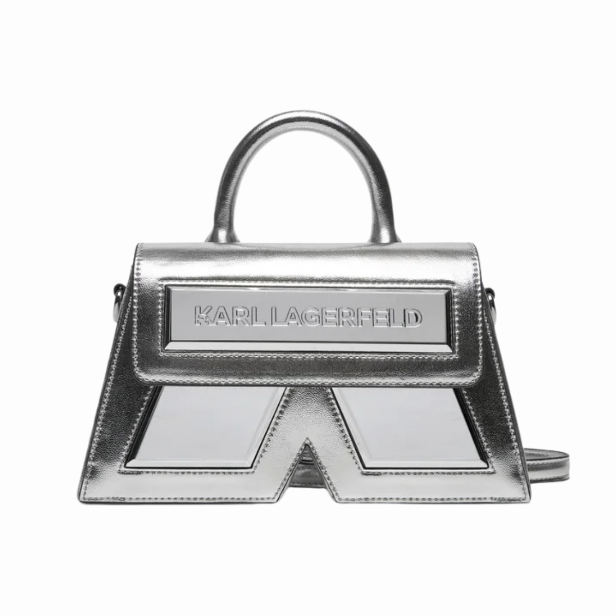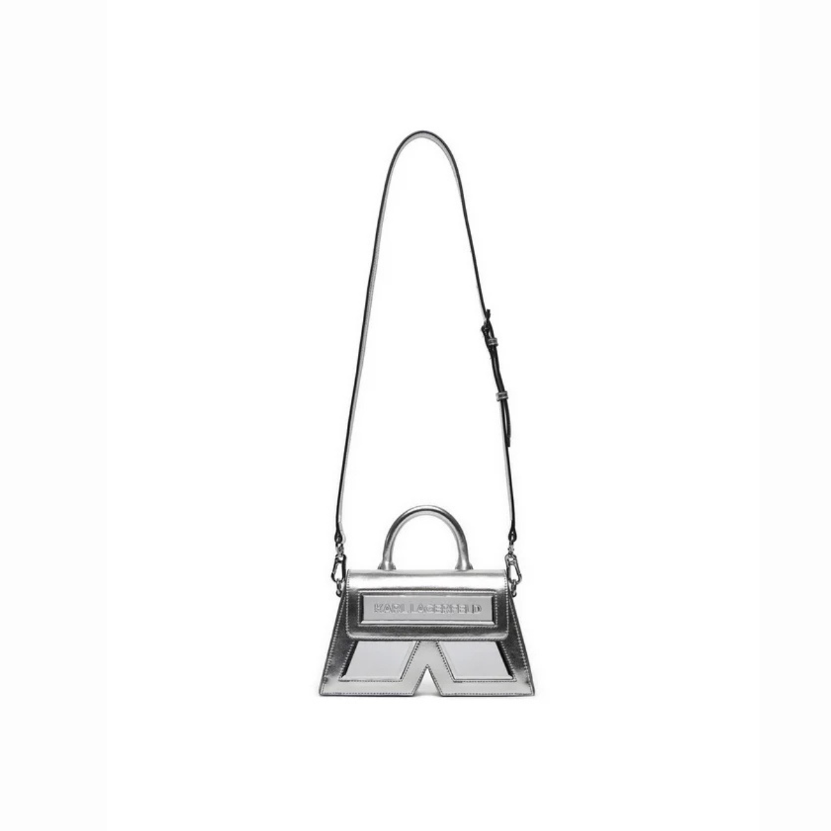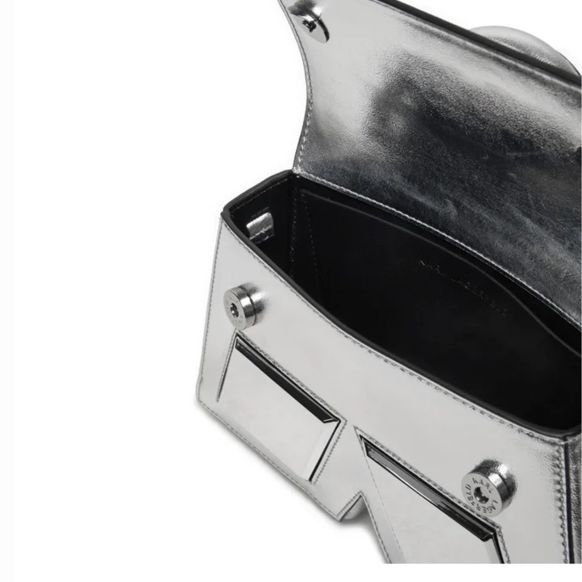 Karl Lagerfeld 245W3095 – išskirtinio dizaino moteriška rankinė, kuri sujungia futuristinį stilių su prabangiu klasikos pojūčiu. Sidabrinės spalvos geometrinė forma ir minimalistinis „KARL LAGERFELD“ logotipas suteikia jai modernumo bei elegancijos.