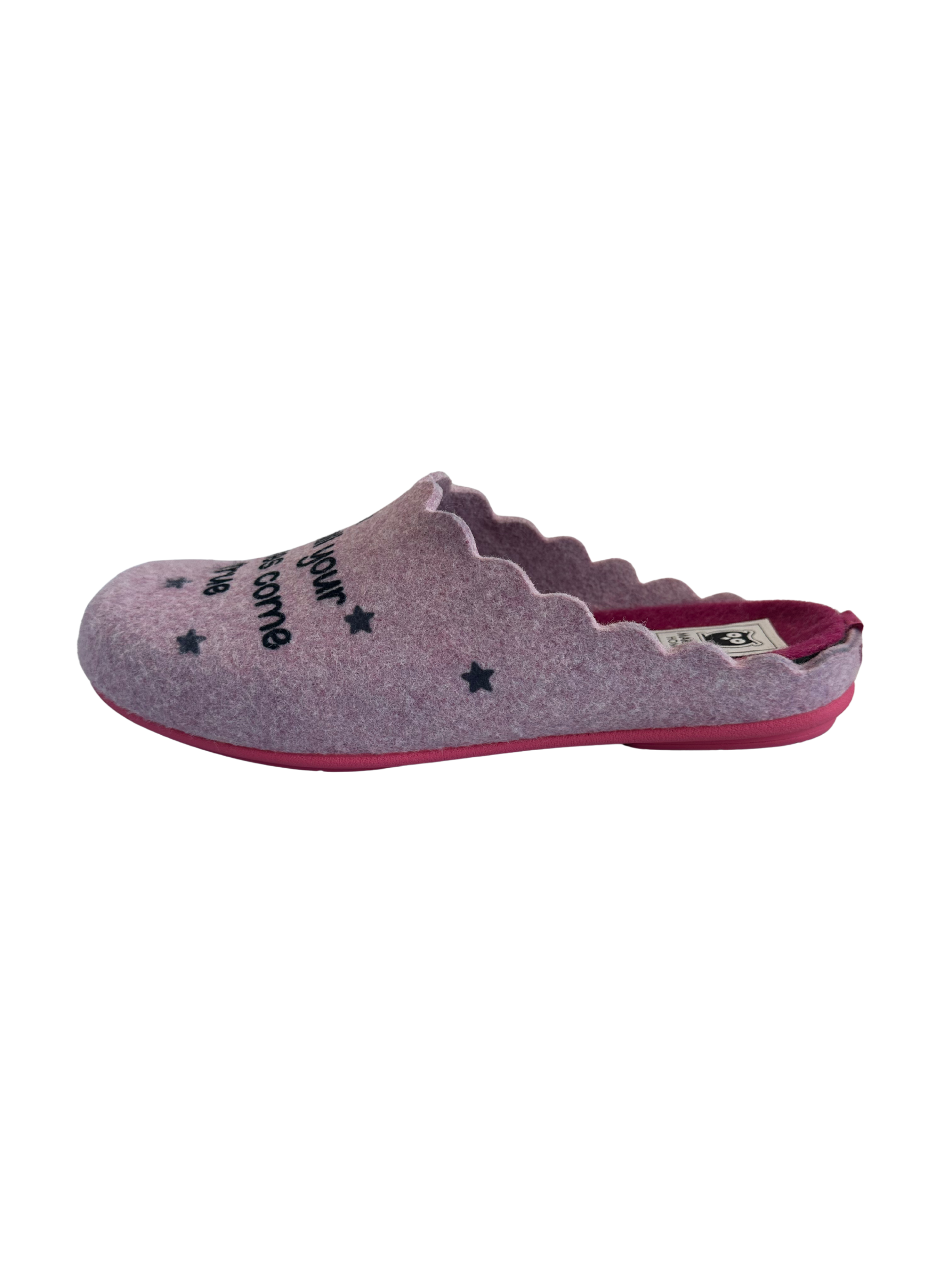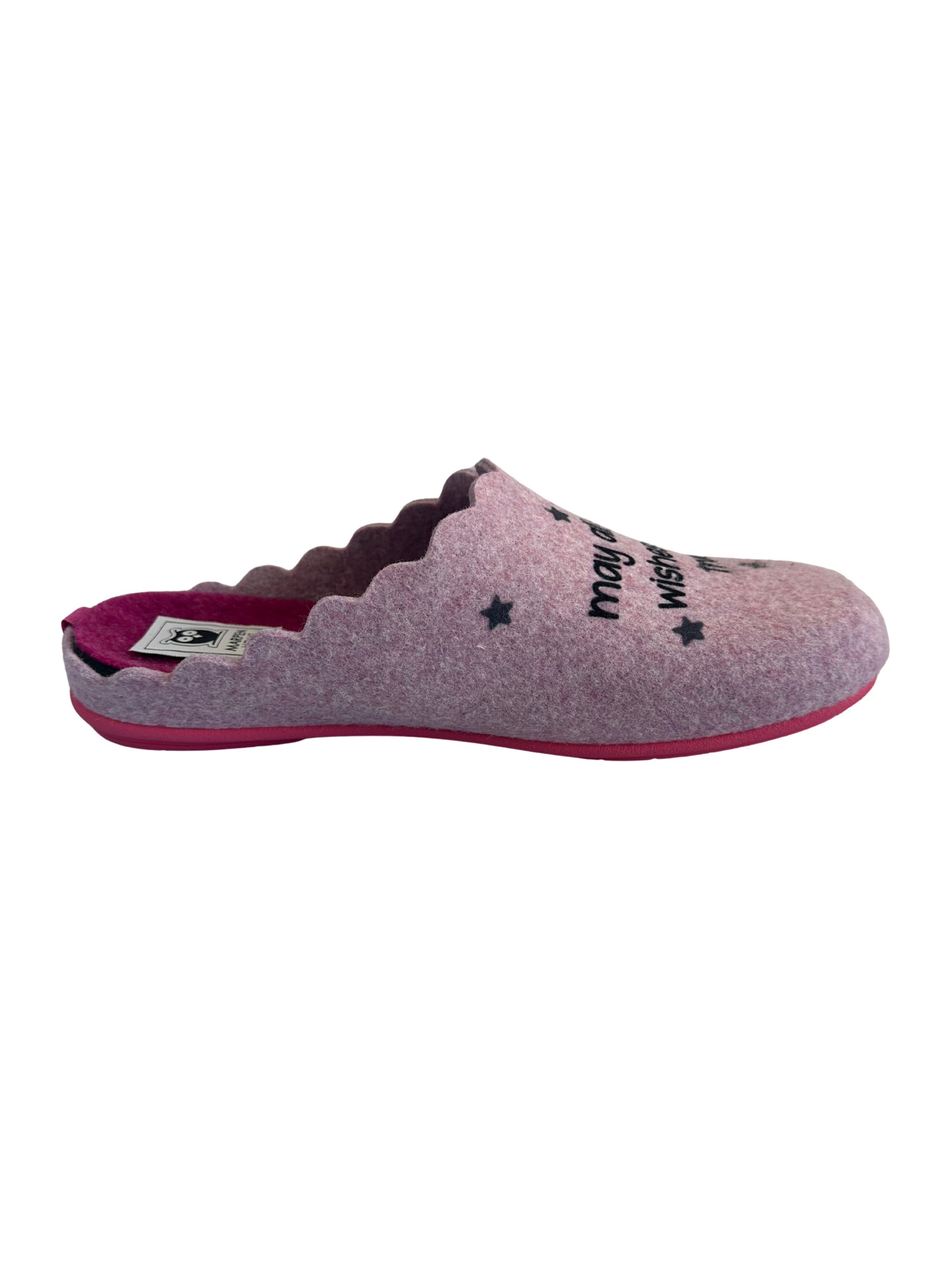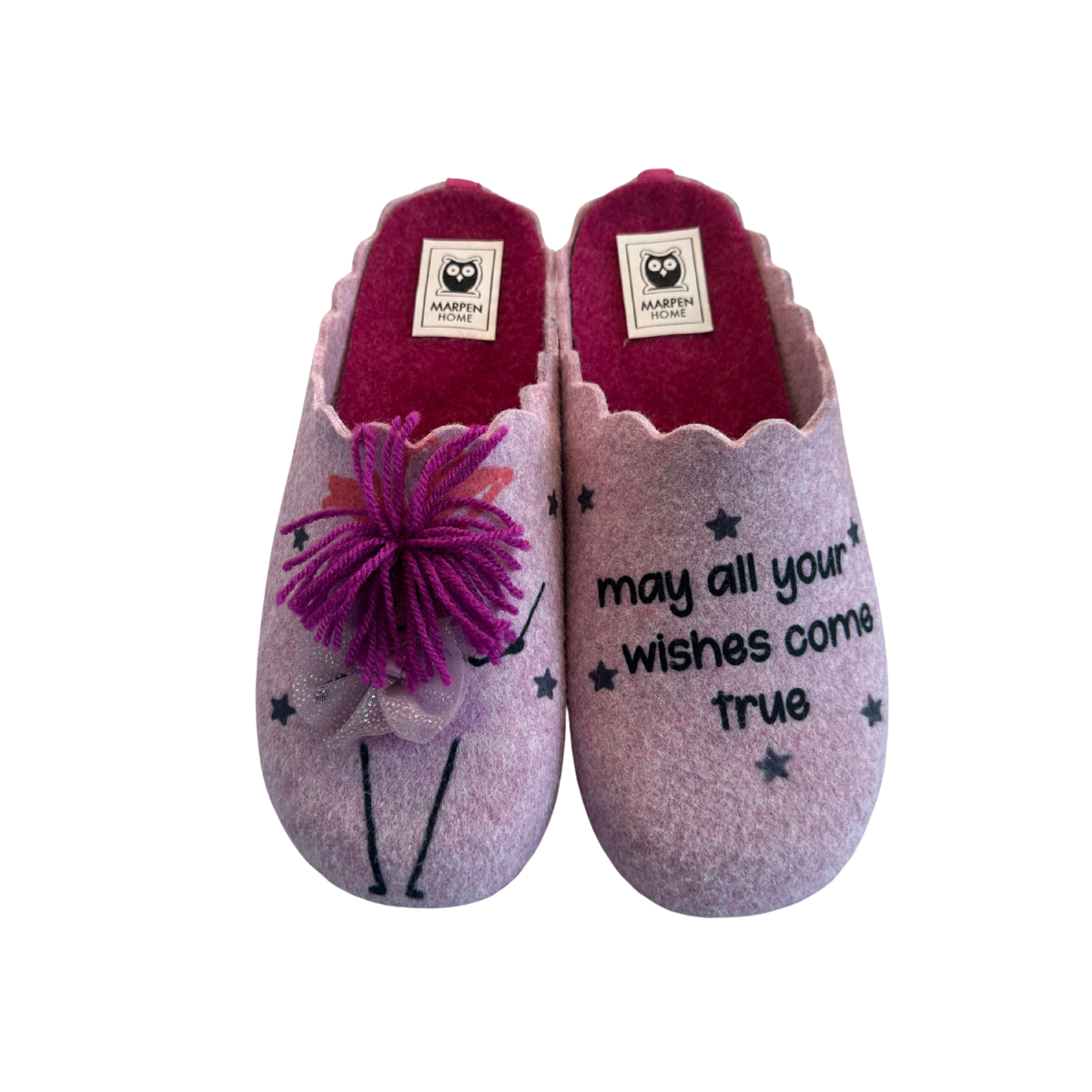 Marpen moteriškos rožinės šlepetės su dekoratyviniu kutu ir užrašu „May all your wishes come true“ („Tegul visi tavo norai išsipildo“). Patogios, minkštos ir stilingos kasdieniam avėjimui namuose.
