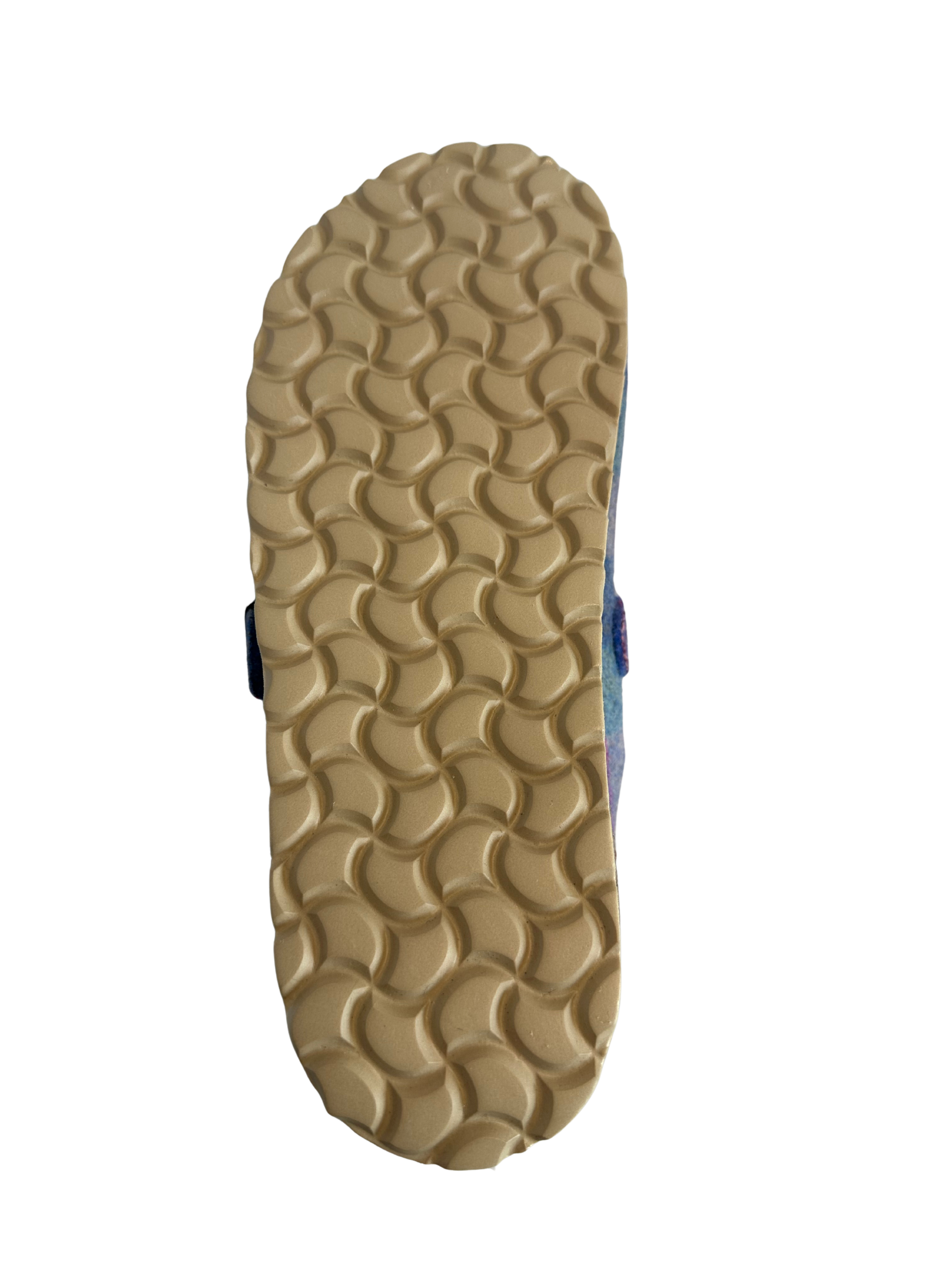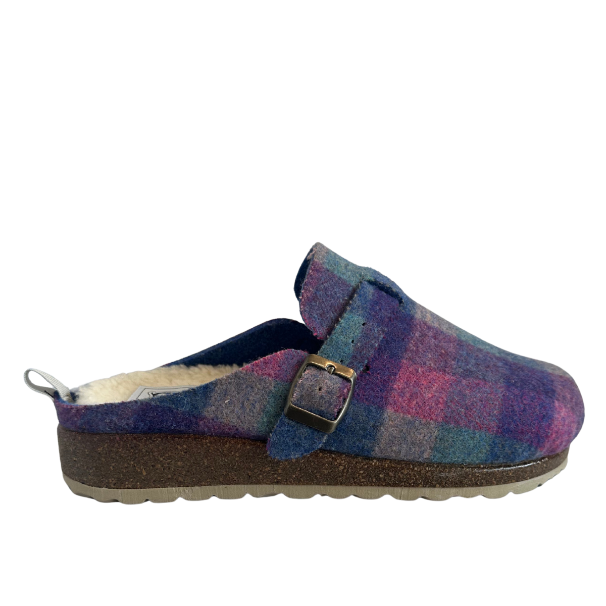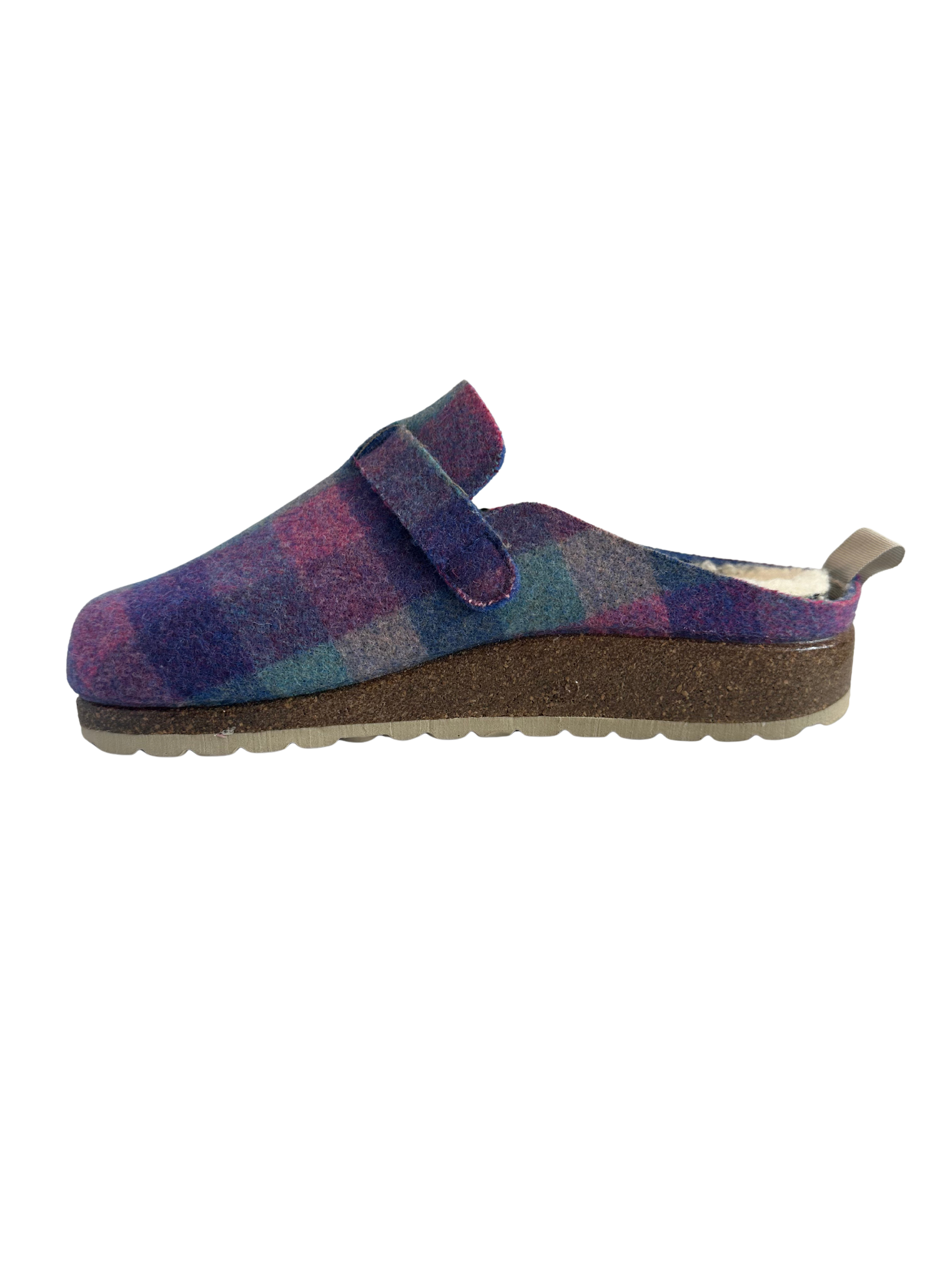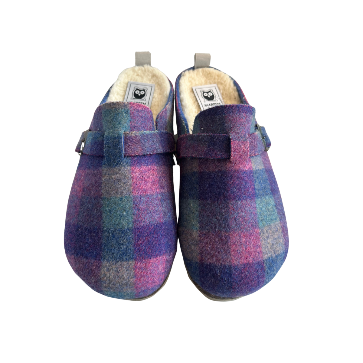 Marpen moteriškos violetinės šlepetės su languotu raštu. Šiltos, patogios ir stilingos, puikiai tinkančios kasdieniam avėjimui namuose.