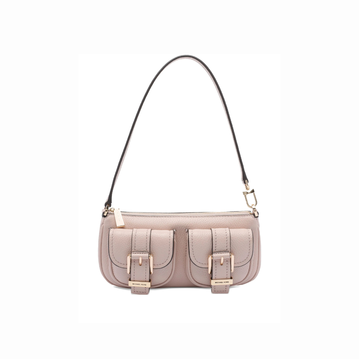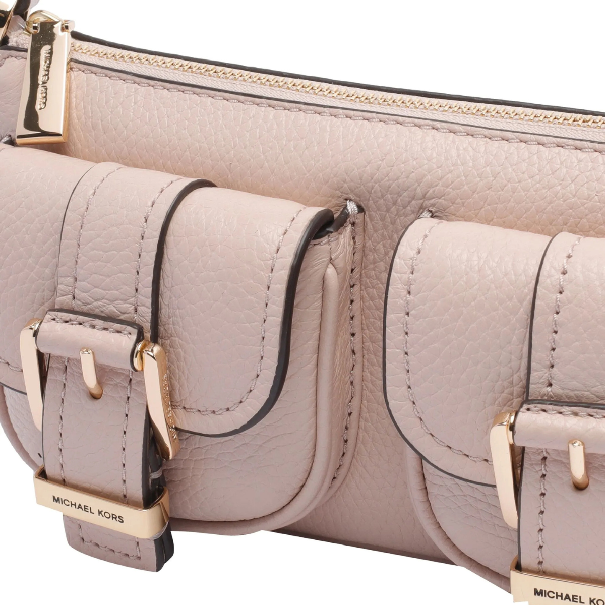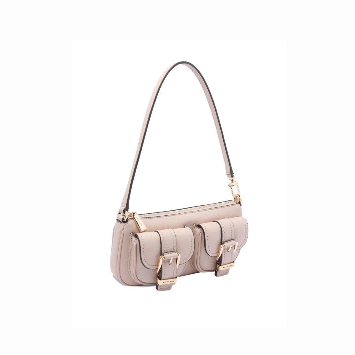 Rankinės priekyje – dvi mažos kišenėlės su sagtimis ir „Michael Kors“ logotipu, kurios suteikia išskirtinį dizaino charakterį. Viduje yra užtrauktuku užsegamas pagrindinis skyrius, tinkamas būtiniausiems daiktams laikyti. Rankena – trumpa, skirta patogiam nešiojimui ant peties ar rankoje.
